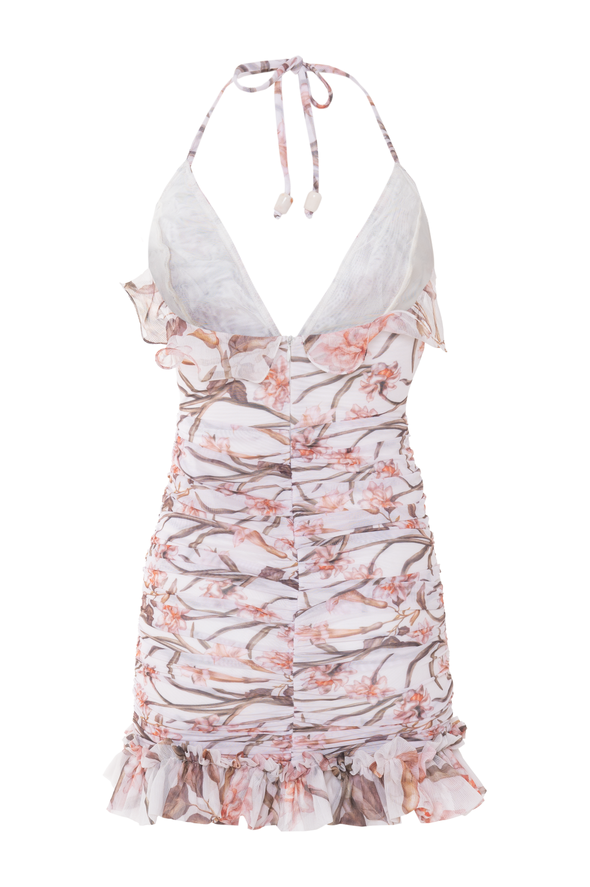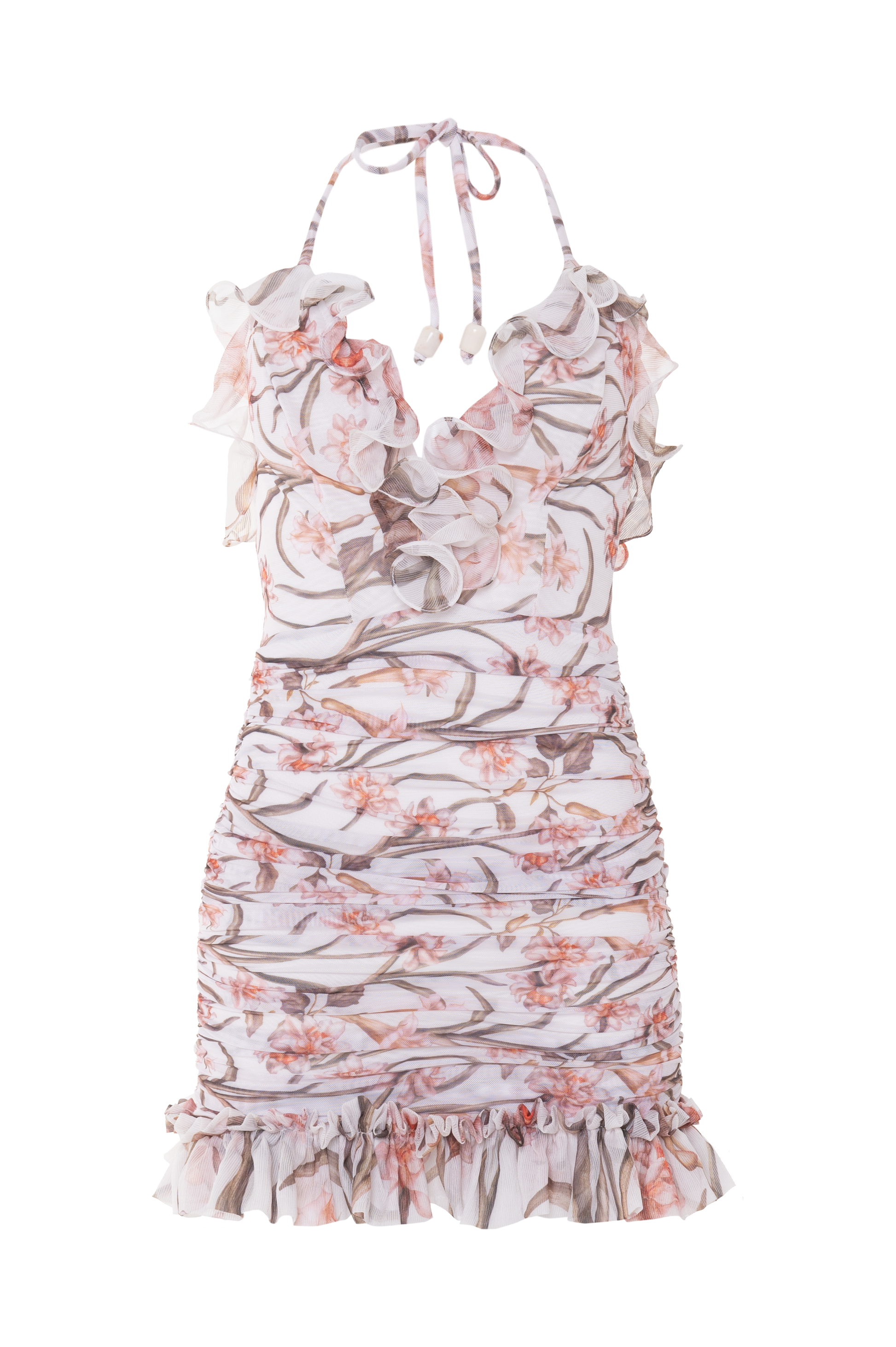 O vestido curto narcissus aposta em uma silhueta justa em tule drapeado, se ajustando perfeitamente ao corpo. O decote e a barra com babados marcantes de chiffon traz todo o movimento e bossa. Uma peça que exala romantismo e leveza, perfeita para o dia ou para a noite