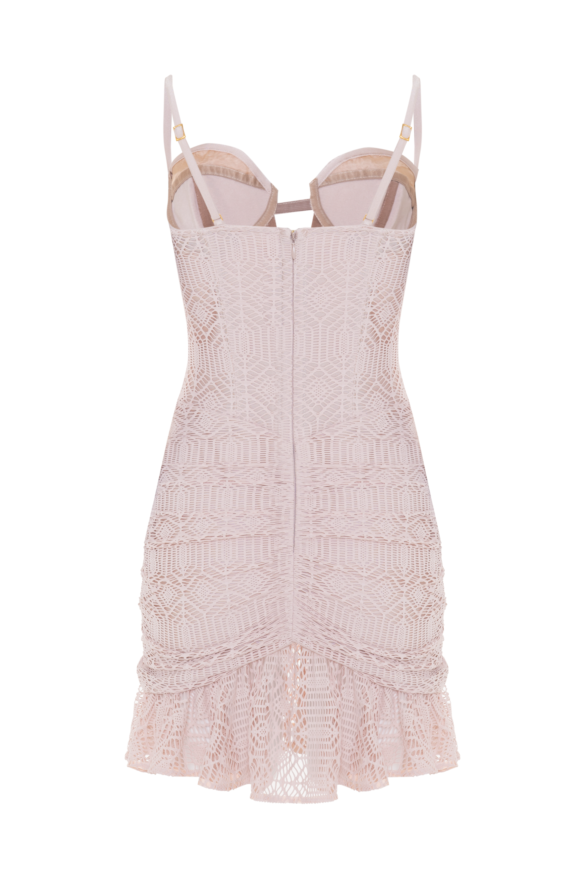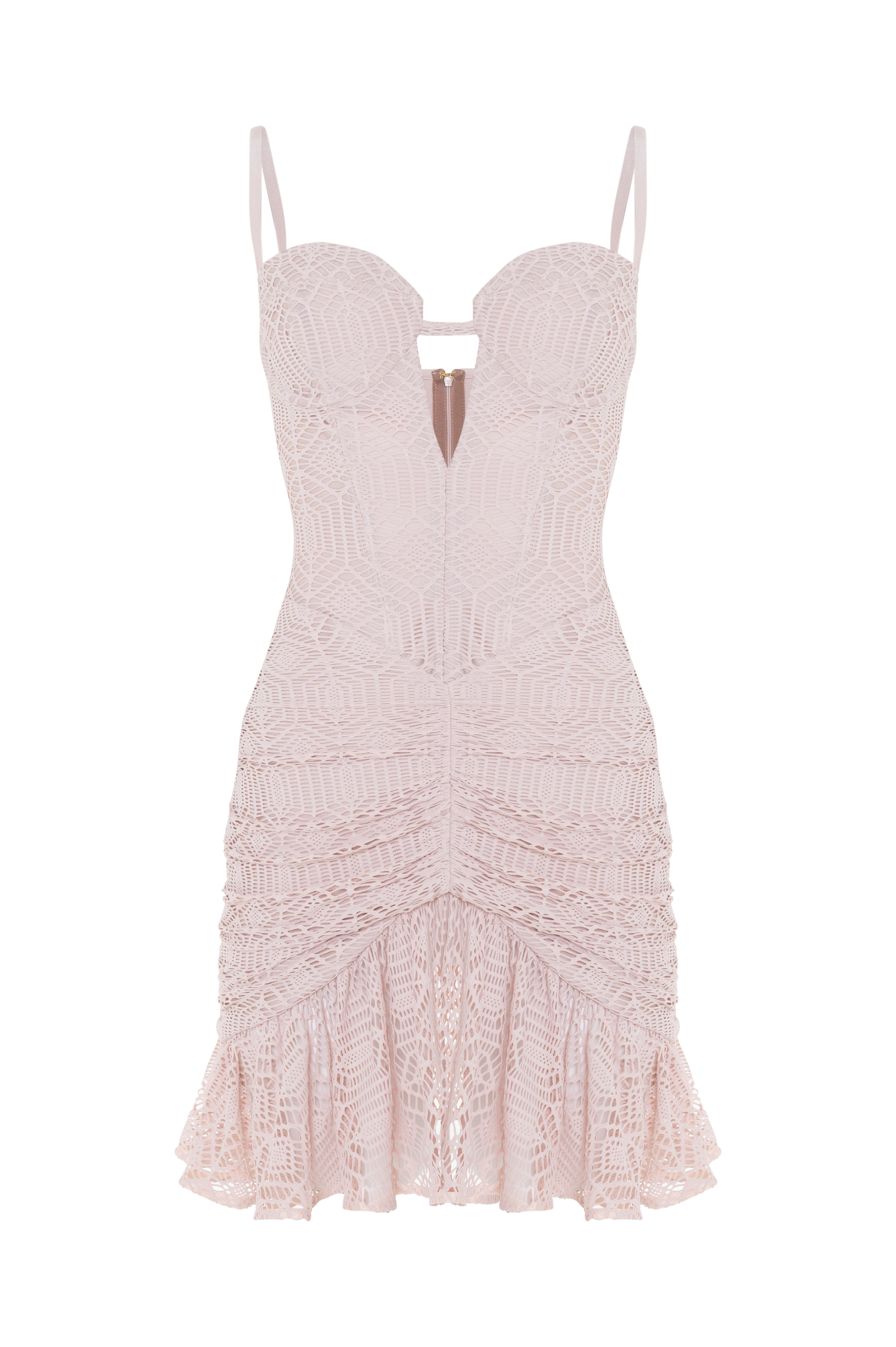 Feminino e charmoso, este minivestido off-white apresenta um corpete estruturado com decote coração e detalhe de recorte frontal. A renda delicada, o leve drapeado e a barra com babados acrescentam textura e movimento, tornando-o a escolha perfeita para festas em dias quentes, encontros românticos ou celebrações à beira-mar.