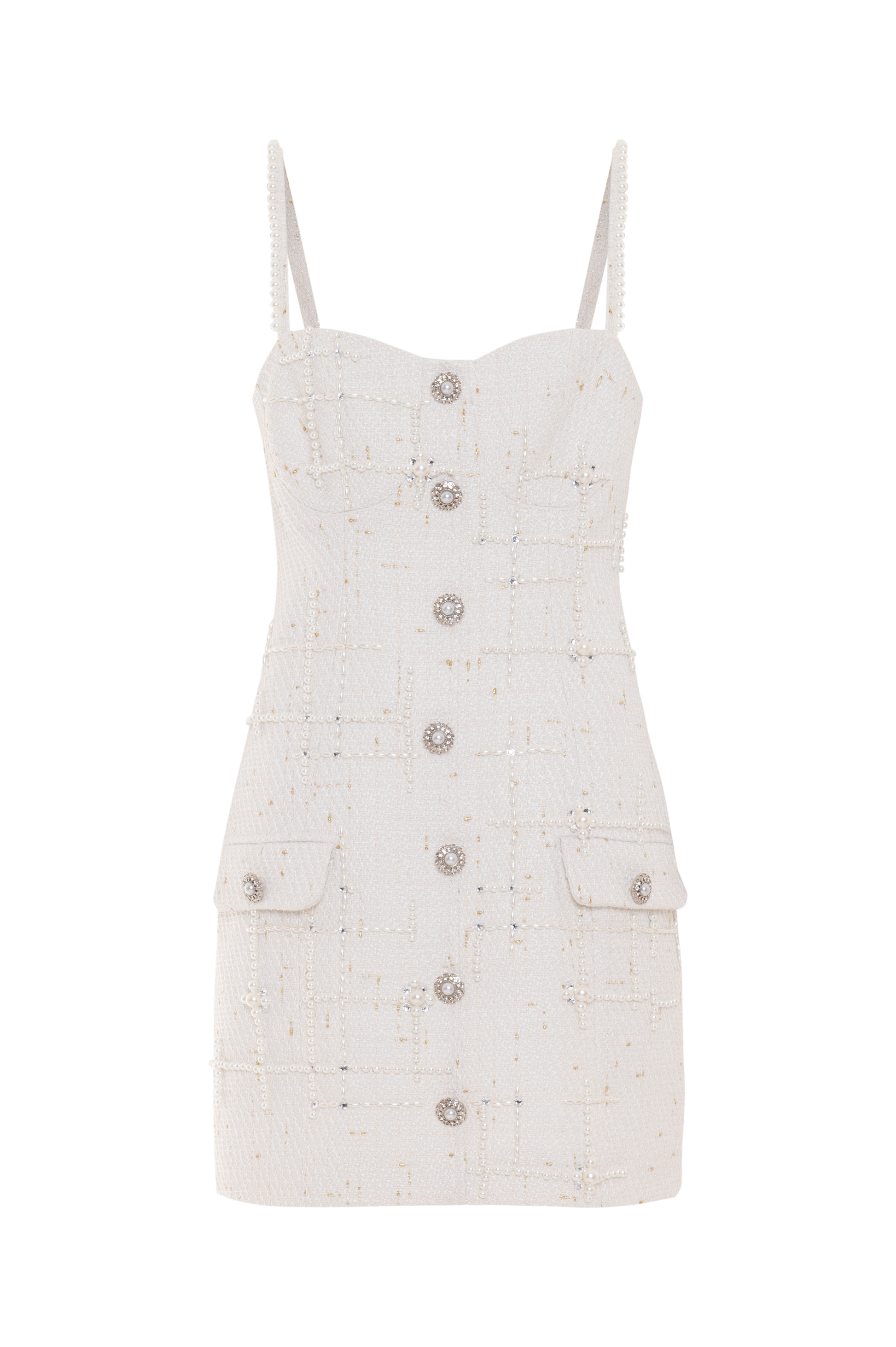 Vestido curto em tweed branco com discretos fios dourados, a peça apresenta bordados manuais em pérolas e cristais aplicados em desenhos geométricos, criando um visual luxuoso e contemporâneo. Com alças finas também bordadas, modelagem justa e estrutura que valoriza o corpo, o vestido é finalizado com botões de cristal que adicionam um toque vintage e refinado. Os bolsos frontais com lapela equilibram o design entre elegância e funcionalidade.