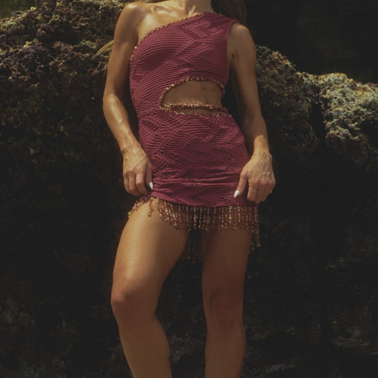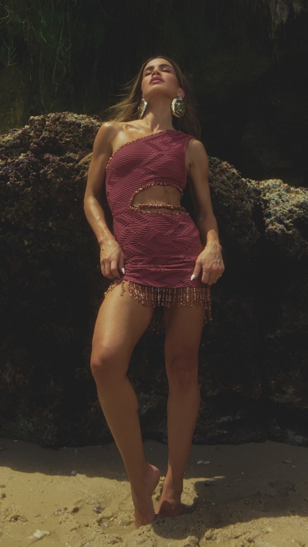 Uma joia em forma de beachdress: o vestido curto em malha rendada é a opção para muito glamour e textura ao redor da praia. Com decote um ombro só drapeado, possui recorte estratégico na cintura, com body chain removível bordada. O charme dessa peça se encontra no bordado rústico especial, com salpicado de pedras naturais no decote, recorte e body chain e franjas com o mesmo material na barra. Finalizado com zíper invisível na lateral e body interno em lycra.