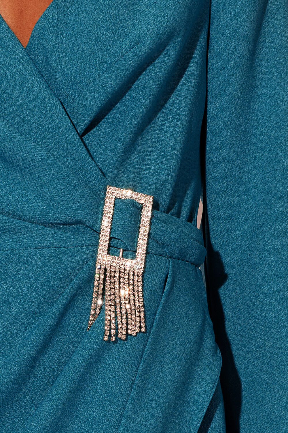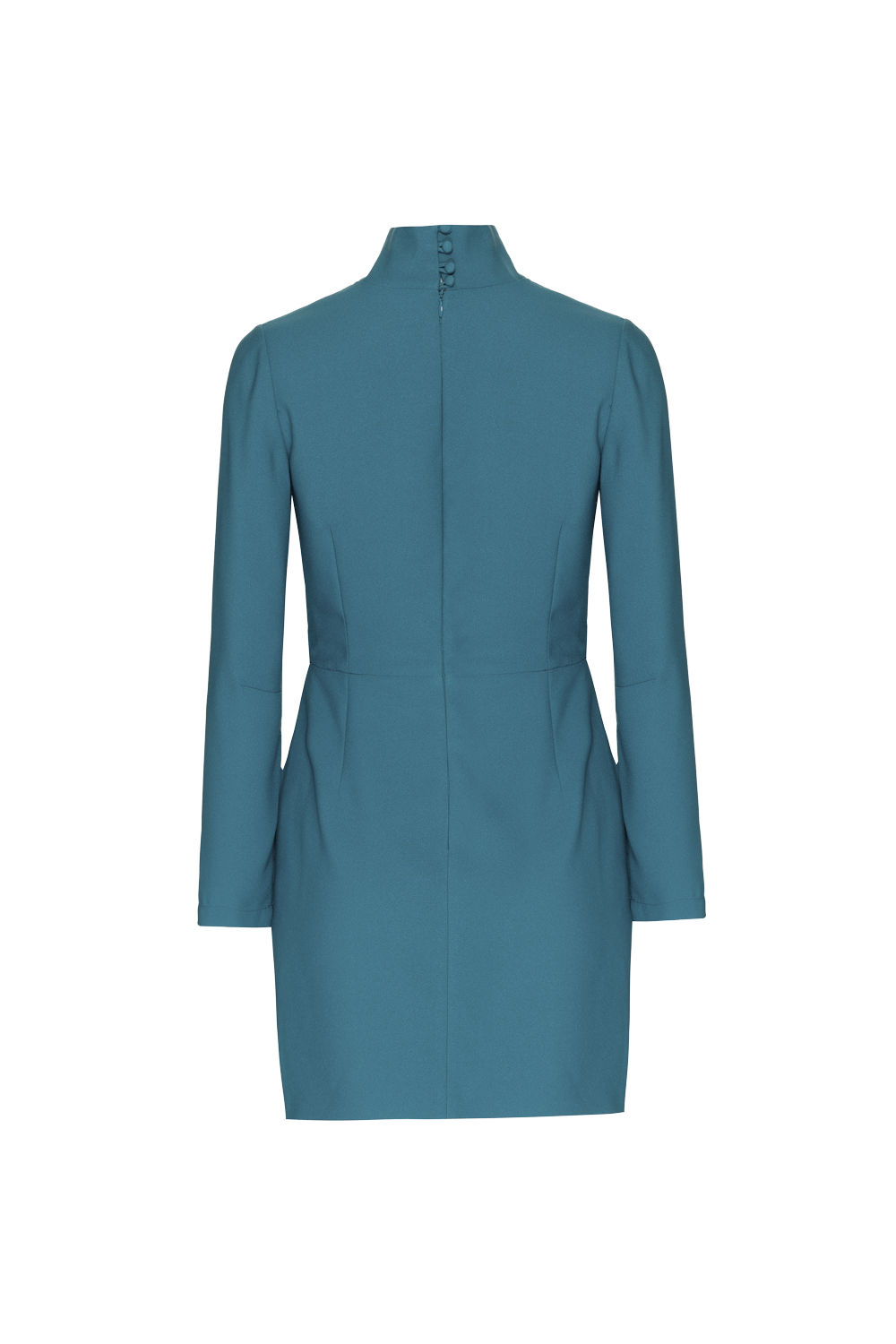 Vestido curto confeccionado em crepe, possui pregas, gola alta, mangas longas, decote transpassado, fivela com strass na cintura, quatro botões encapados na nuca, zíper invisível no centro costas e forro interno.