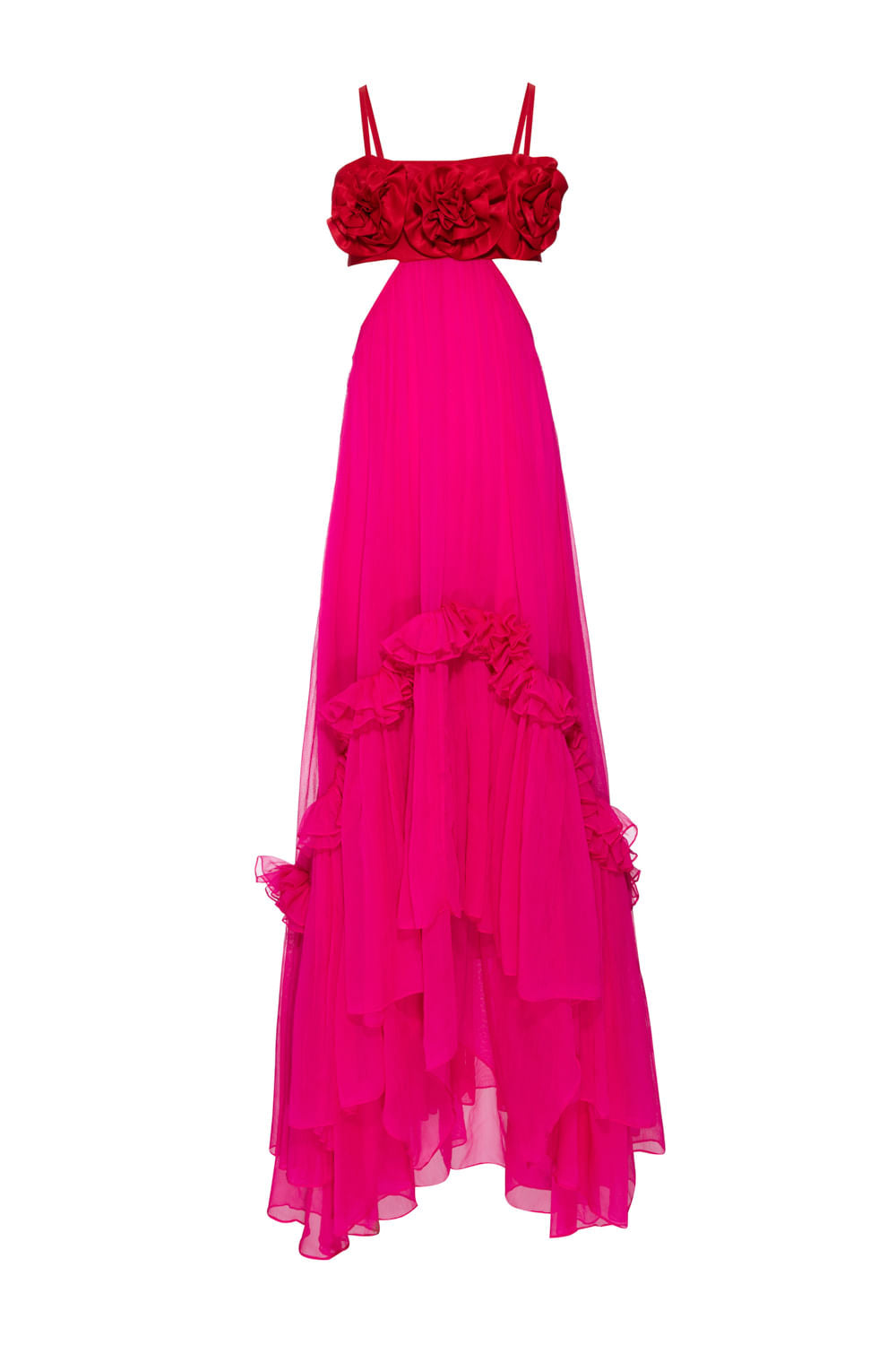 Vestido longo com flores aplicadas no busto, abertura nas laterais, alças finas e reguláveis, babados sobrepostos na saia, barra assimétrica, cinco botões encapados para fechamento do top, zíper invisível no centro costas e forro interno.