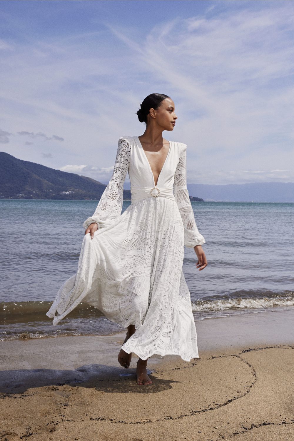 Vestido longo com body forrado, mangas compridas, ombreiras, aros no decote para sustentação, cinto franzido sobreposto com argola central, cordões para amarração na linha posterior dos ombros e três botões de pressão no fechamento da calcinha.
