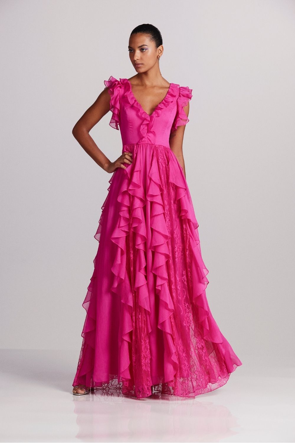 VESTIDO LONGO BABADOS RENDA SILKY STARDUST PINK