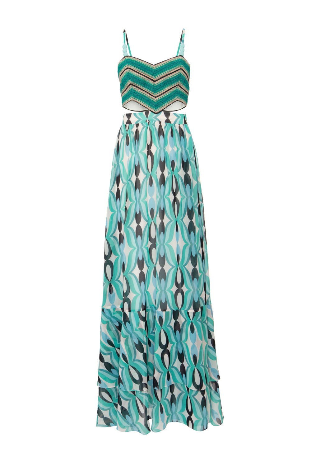Vestido longo com busto em entremeio de crochê, recortes vazados nas laterais, saia longa estampada com fenda, alças finas e reguláveis, zíper invisível no centro costas e forro interno.