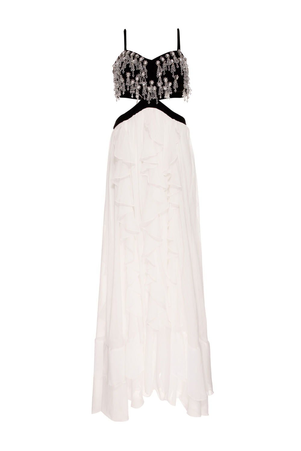 VESTIDO LONGO BUSTO PEDRARIA VELUDO CRYSTAL OFF WHITE