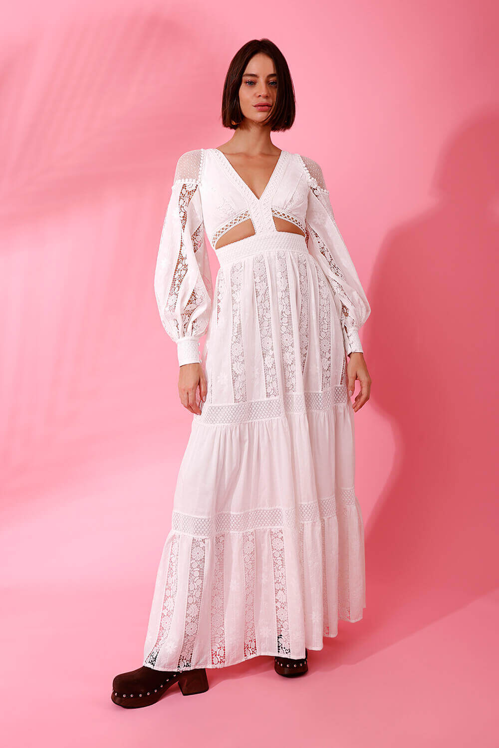Vestido longo confeccionado em laise, possui recortes vazados, aplicação de entremeio, mangas longas, três botões encapados nos punhos, zíper invisível no centro costas e forro interno.