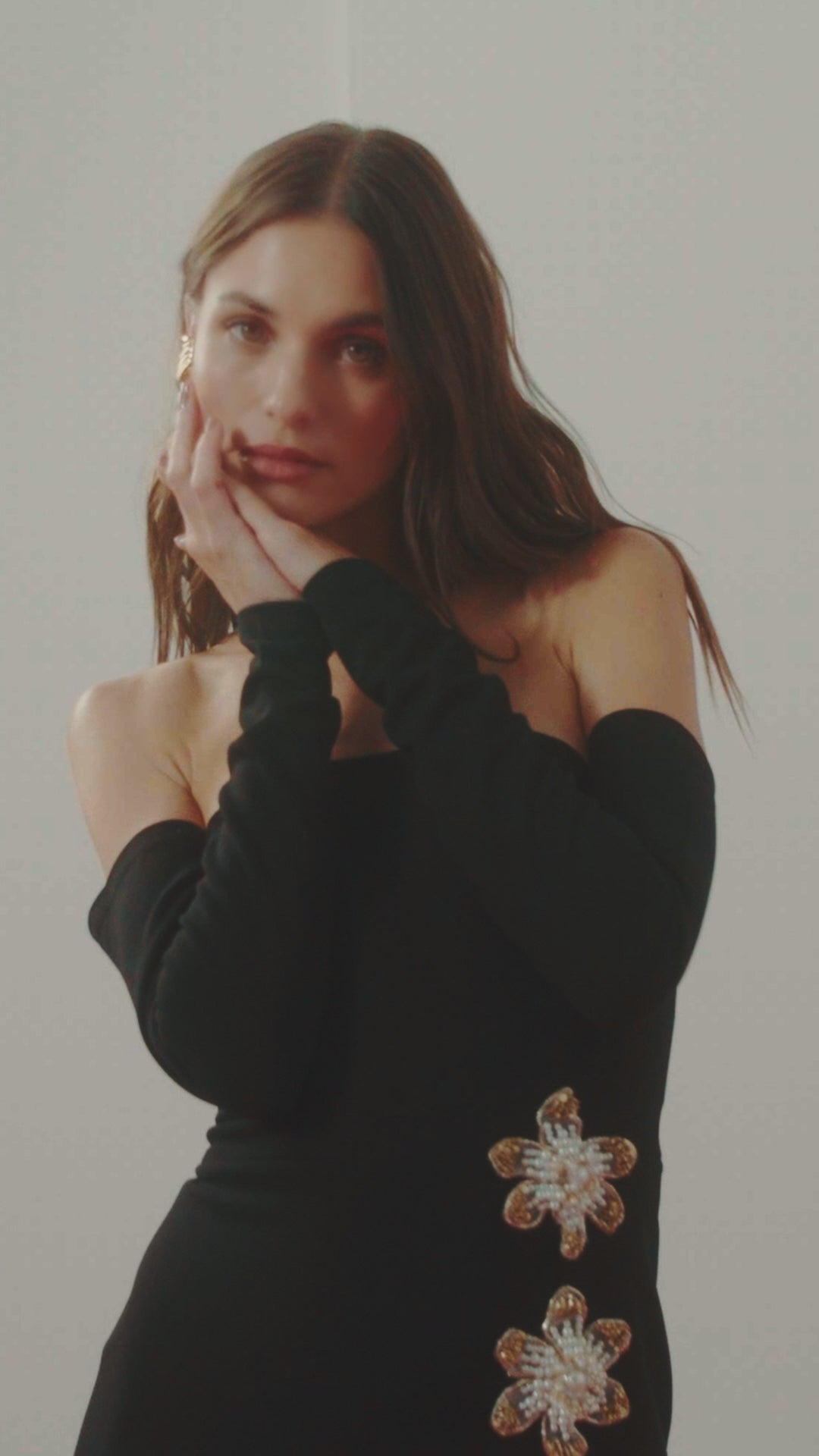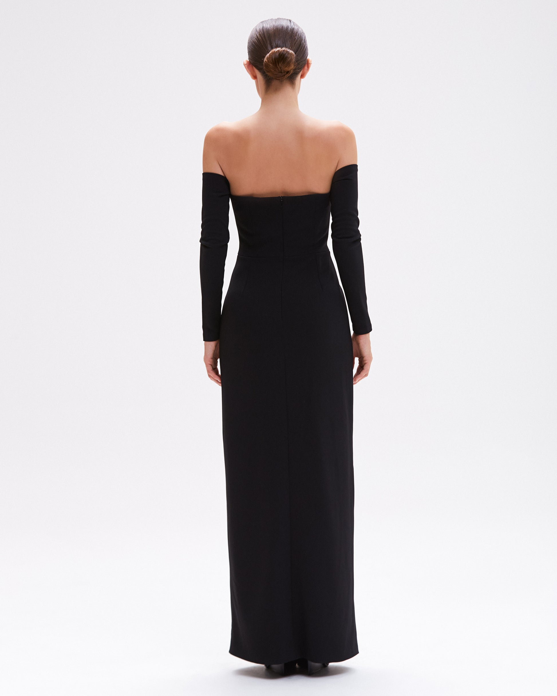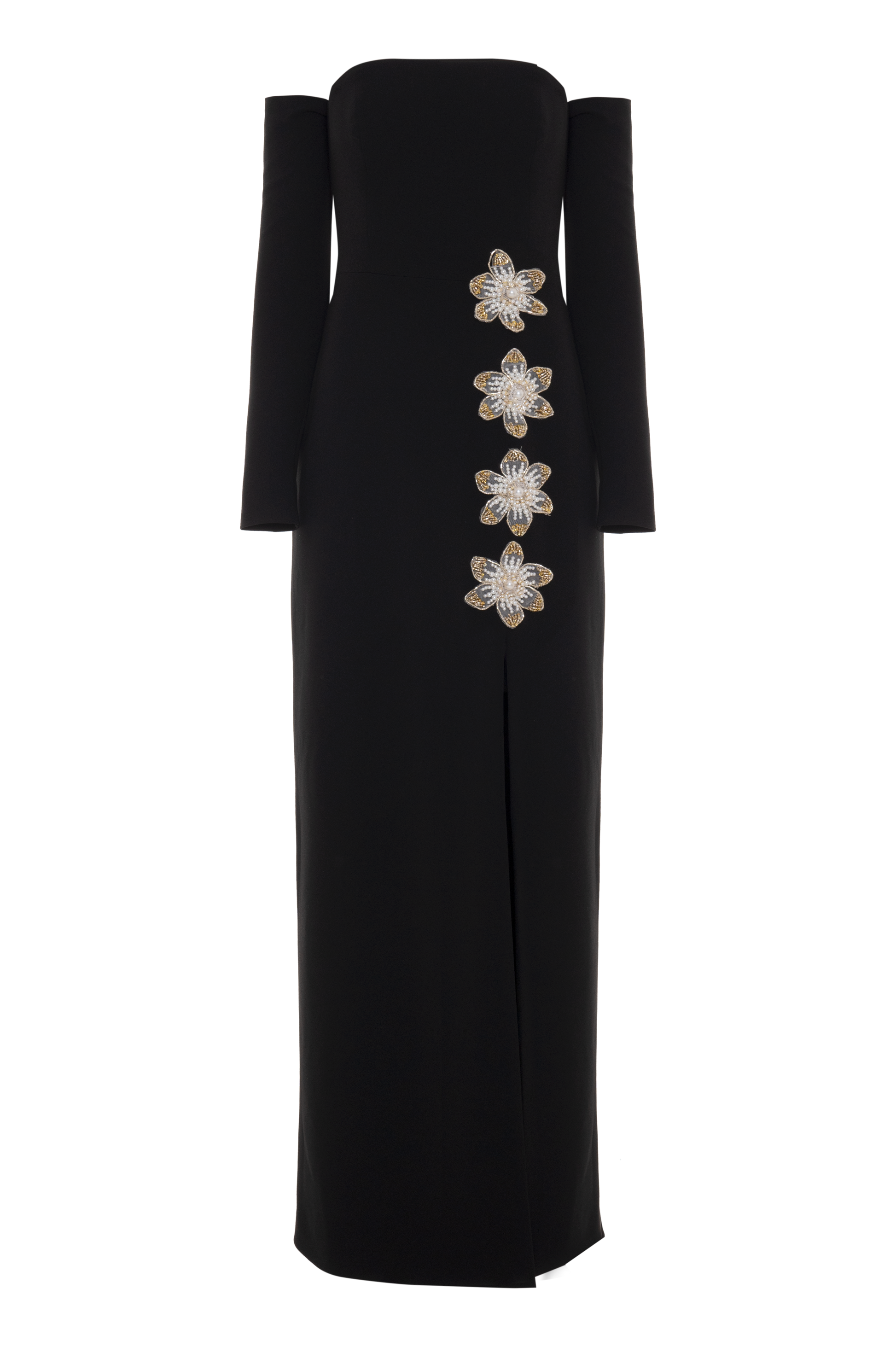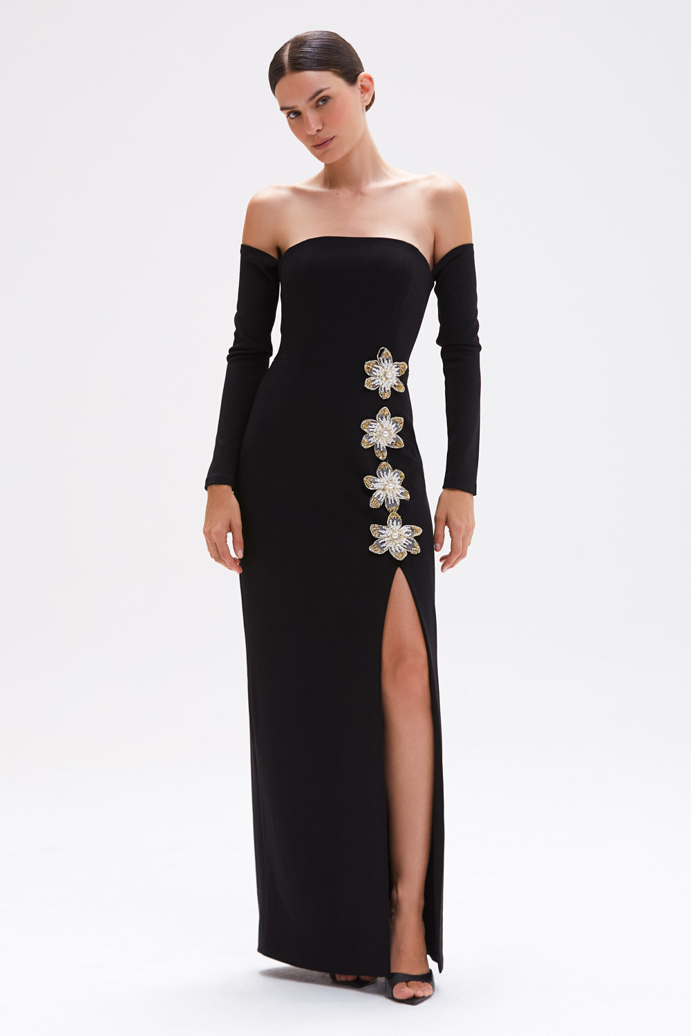 O vestido longo ombro a ombro em Crepe mystique apresenta um look que combina a sofisticação do clássico com a ousadia e DNA Patbo.O vestido em malha crepe possui bordado de flores com pérolas e vidrilhos dourados, corpo ajustado com corset interno para estruturar a silhueta, manga longa, fenda importante na frente e fechamento com zíper invisível nas costas.