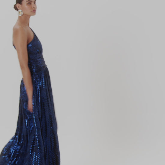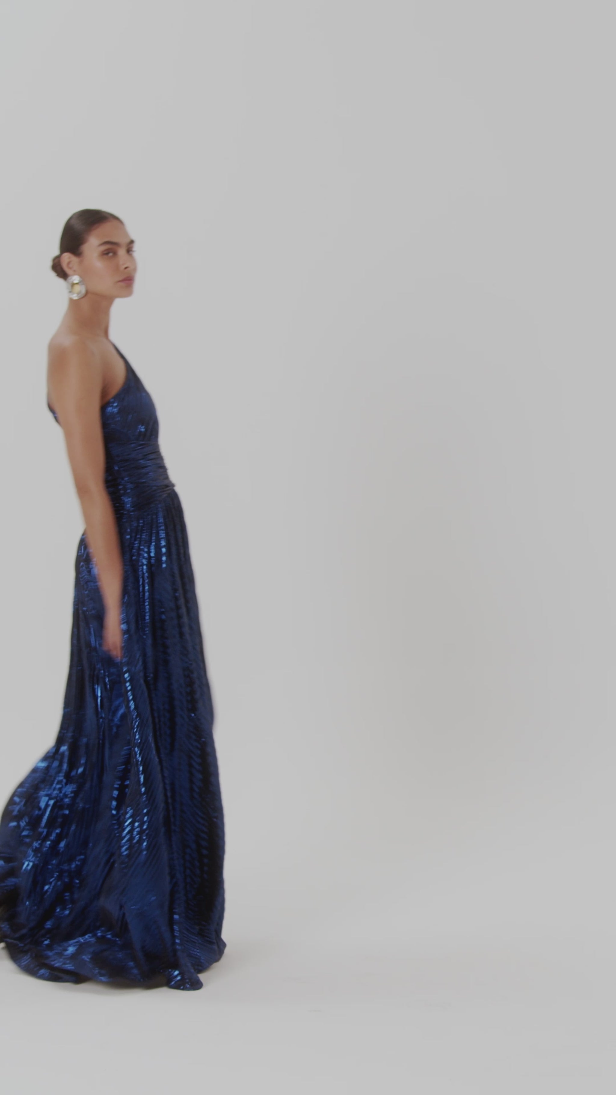Um deslumbrante look para a noite, este vestido azul-marinho é confeccionado em tecido plissado metálico que reflete a luz a cada movimento. Com design de um ombro só e manga longa fluida franzida no punho, exala elegância moderna. O recorte na cintura adiciona um toque ousado, enquanto a saia longa e esvoaçante conta com uma fenda alta que garante leveza e um toque de sedução.