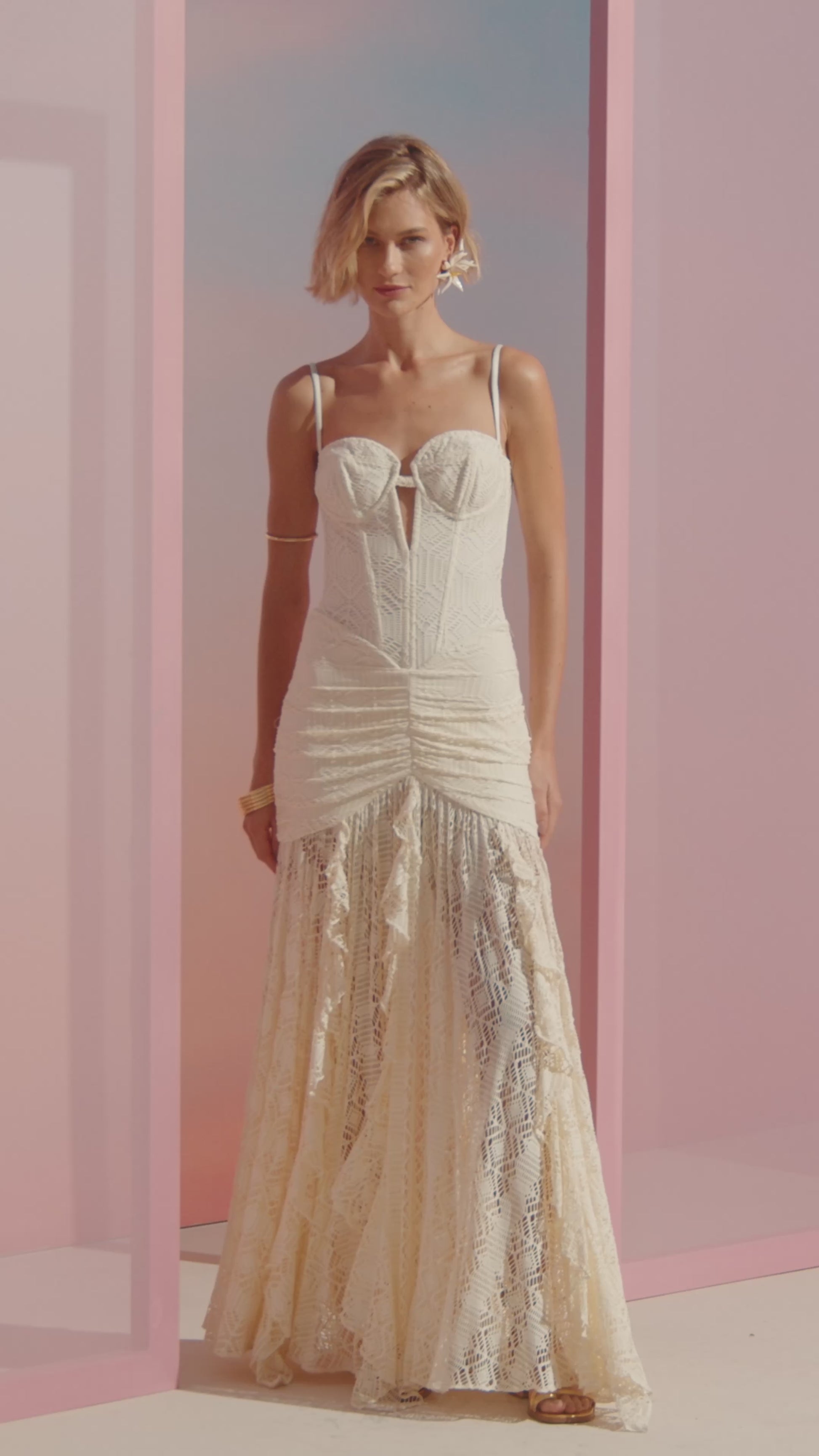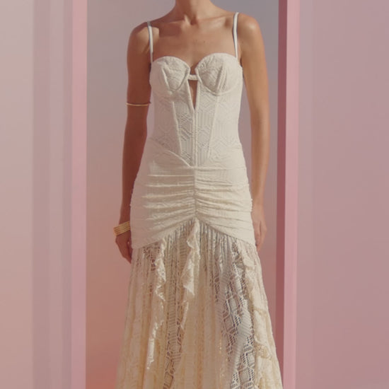 Romântico e sofisticado, este vestido longo off-white em renda apresenta corpete estruturado em estilo espartilho, com decote coração e detalhe de recorte. O drapeado nos quadris valoriza a silhueta, enquanto a saia ampla, em comprimento até o chão e camadas de renda, adiciona movimento e elegância — perfeito para celebrações formais, festas ao pôr do sol ou ocasiões especiais de verão.