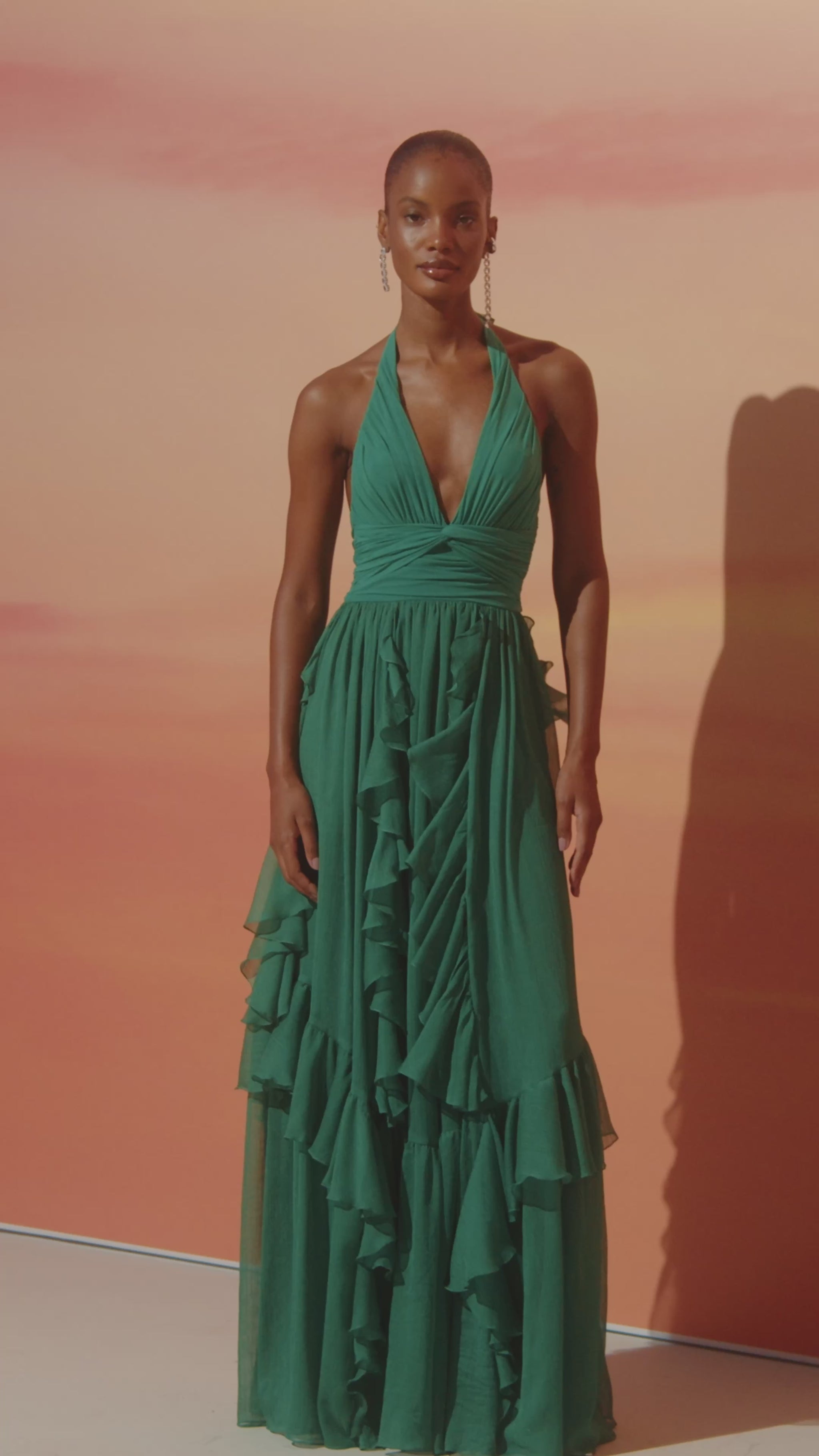 Elegantemente descomplicado, este vestido longo com decote frente única é uma celebração do movimento e da feminilidade. O corpo de tule traz um decote profundo e cintura drapeada que valoriza a silhueta com suavidade e se adapta ao corpo. Os babados em cascata adicionam um toque de leveza e charme a cada passo. Nas costas, o modelo aberto com amarração delicada no pescoço reforça a vibe sensual e solar — perfeito para um coquetel ao pôr do sol no Rio ou uma festa ao ar livre à beira-mar.