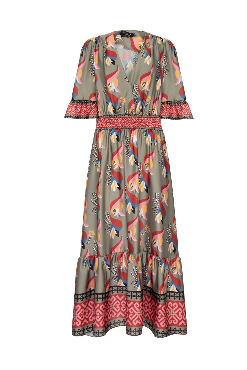 Vestido mídi com decote em v transpassado, mangas ¾ estilo sino, ombreiras, fios de lastex na cintura, recorte franzido na saia e forro interno.