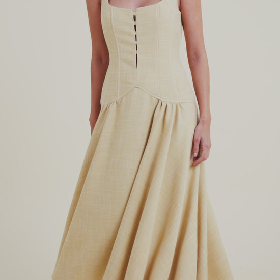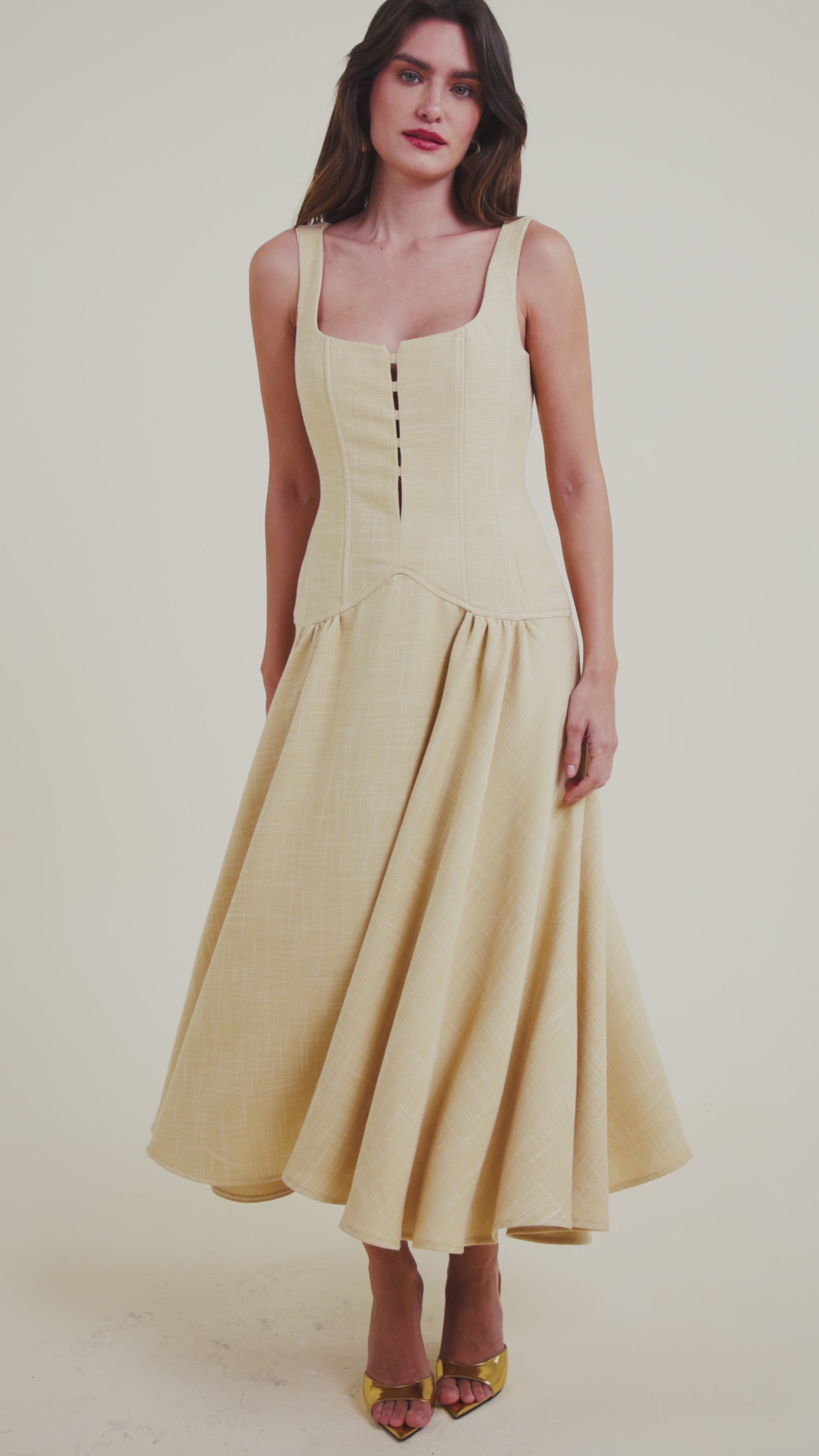 Confeccionado em linho rústico, este vestido midi combina estrutura e leveza em um design de inspiração artesanal. O top espartilhado, com delicado detalhe frontal em tiras, valoriza a silhueta com feminilidade e elegância. A saia godê com franzidos traz movimento e fluidez ao visual, enquanto o zíper de metal nas costas adiciona um toque contemporâneo.