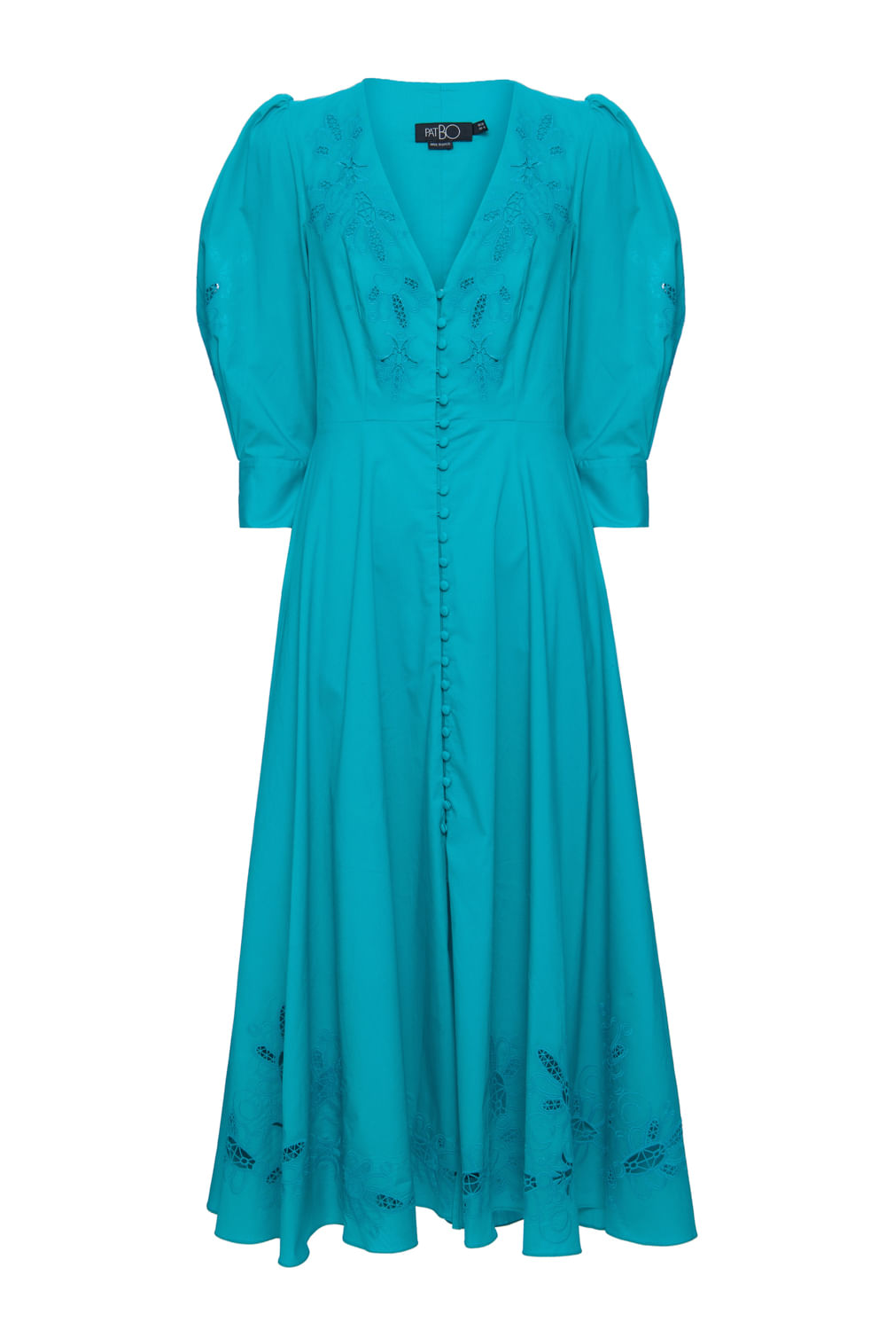 Vestido com 22 botões encapados, no centro frente, bordado vazado no busto, nas mangas e na barra da saia. Mangas volumosas com punho duplo (2 camadas de tecido) ajustado com 3 botões encapados. Forro no busto até a altura do joelho.