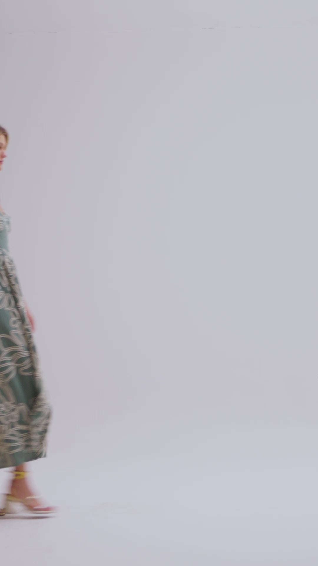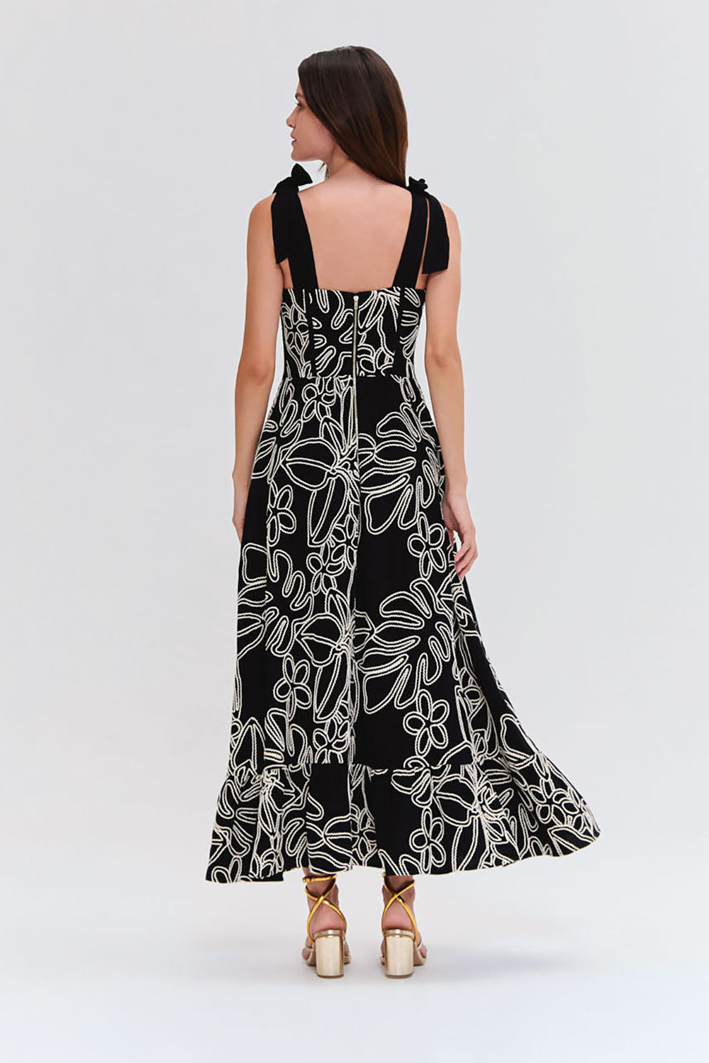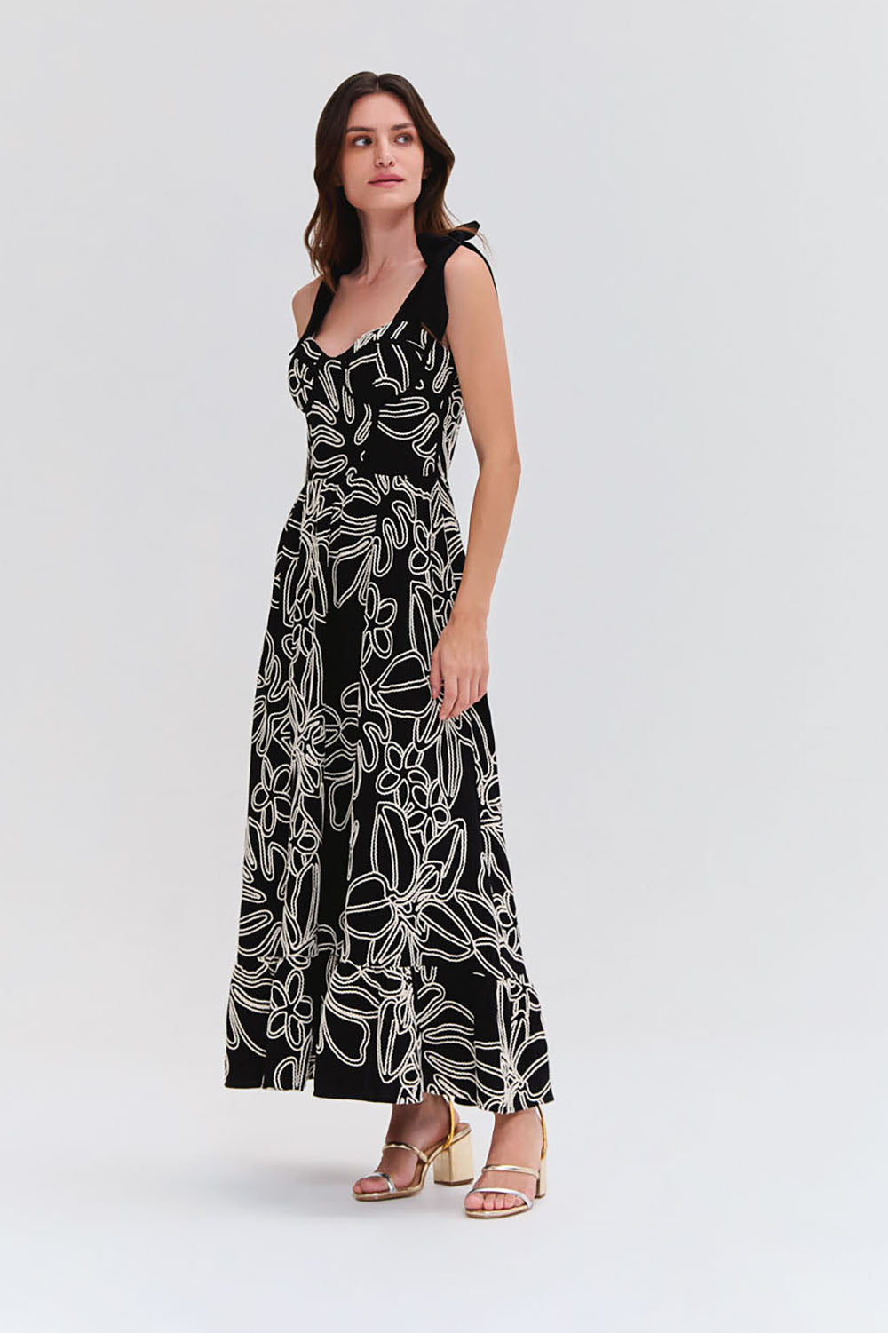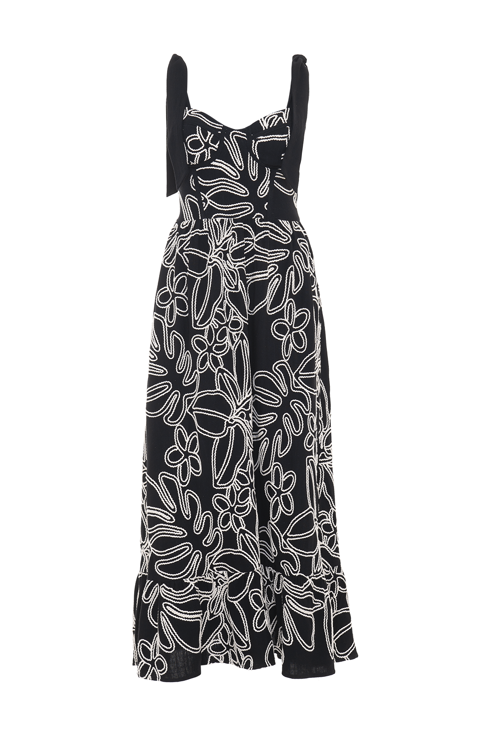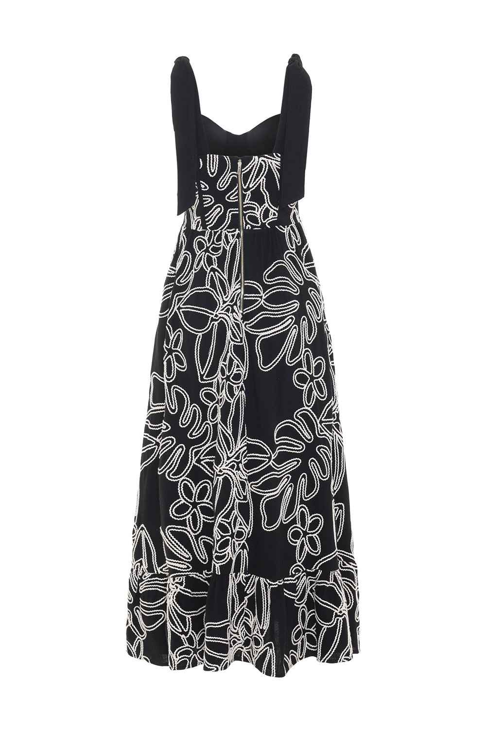 Vestido midi confeccionado em viscolinho bordado com forro, possui busto com aro e bojo, corpo com barbatanas, saia com leve franzido e babado na barra, faixas largas para amarração no ombro e zíper de metal nas costas.