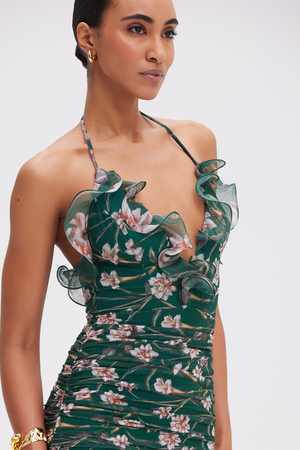 O vestido midi narcissus aposta em uma silhueta justa em tule drapeado, se ajustando perfeitamente ao corpo. O decote com babados marcantes de chiffon traz todo o movimento e bossa. Uma peça que exala romantismo e leveza, perfeita para eventos ao entardecer e noites quentes de verão.