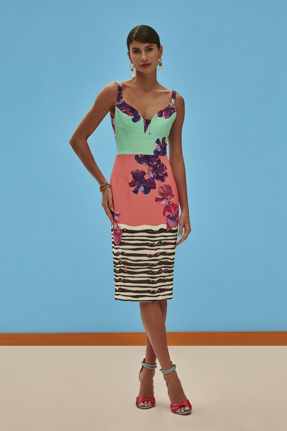 Vestido mídi estampado com alças que saem da frente do busto e vão engrossando até chegar nas costas, bem acinturado, com decote e zíper invisível nas costas e forro interno.