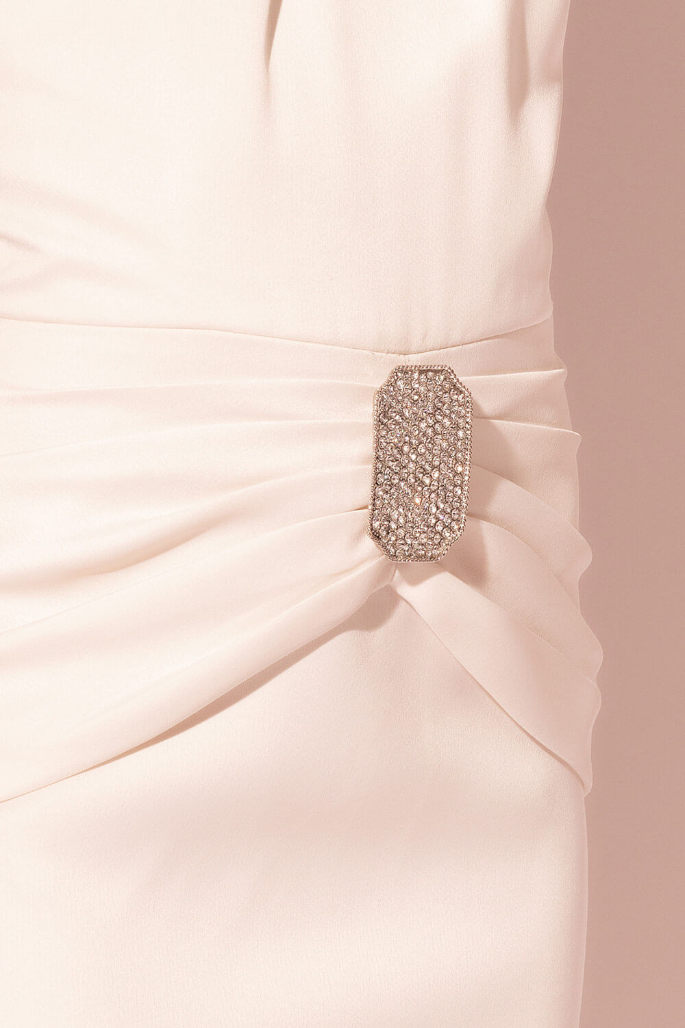 Vestido mídi confeccionado em crepe, possui pregas, gola alta, pala franzida na cintura, fivela de strass, barra assimétrica, três botões encapados na nuca, fenda posterior, zíper invisível no centro costas e forro interno.