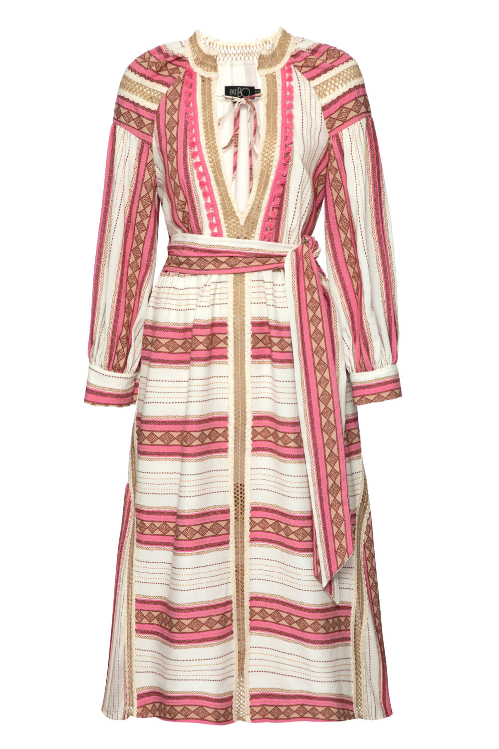Vestido mídi com dois tipos de entremeio (vazado e com mini tassels), dois cordões (com ponteiras) no decote frontal, mangas longas, faixa dupla para amarração na cintura, dois botões em cada punho e forro interno.