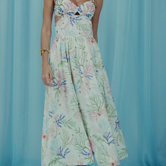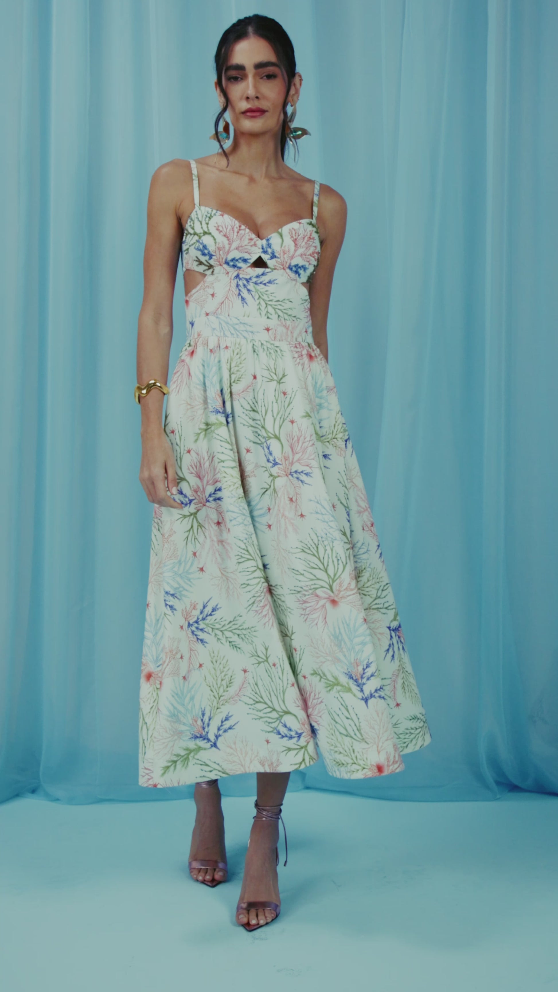 O vestido midi em tricoline seaweed é uma escolha perfeita para dias quentes de verão. Com recorte estratégico na frente, possui saia rodada ampla, agregando movimento e leveza para o look. O toque final está no rebordado da estampa no busto. Finalizado com zíper invisível nas costas.