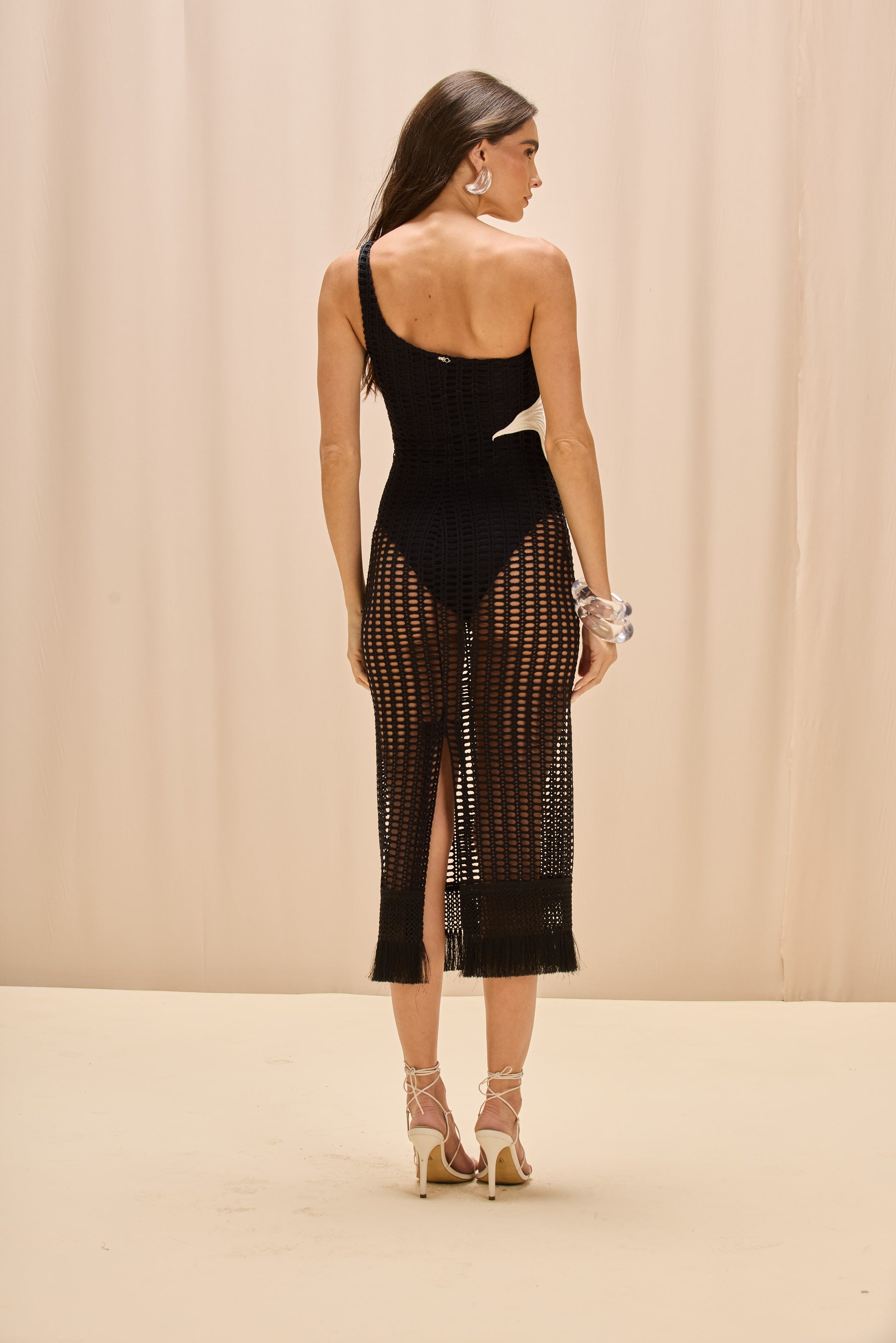 Esse vestido midi é o equilíbrio perfeito entre ousadia e elegância. Com ombro único, possui detalhe de bordado matelassê inspirado na flor copo de leite, o body interno e o corpo em tela sem forro complementam o look resort perfeito. Finalizado com franja na barra.