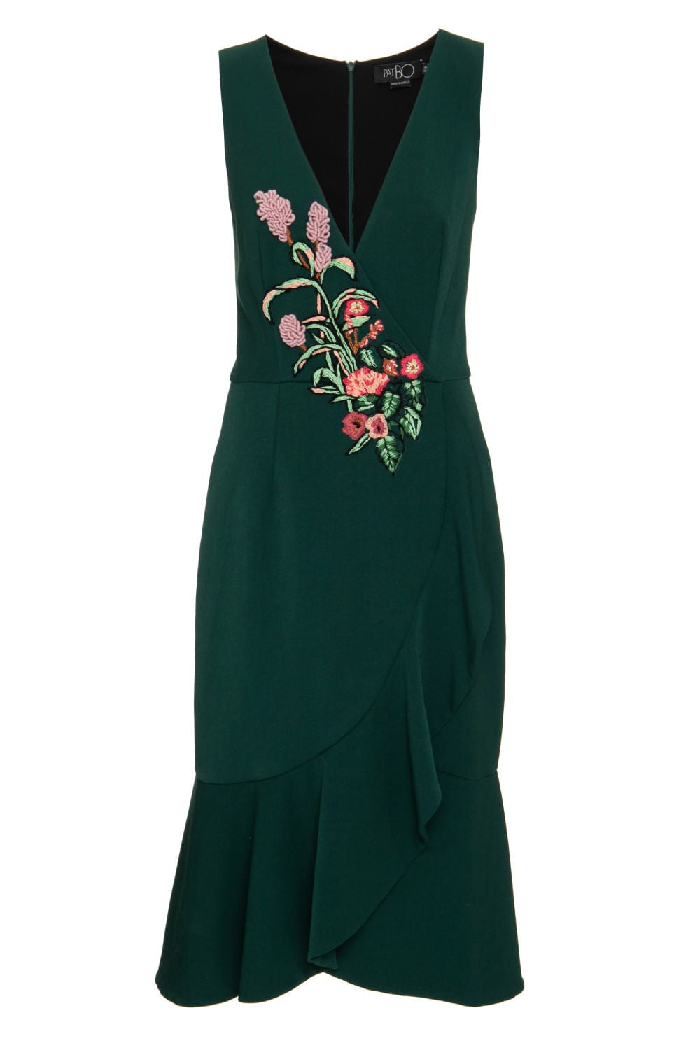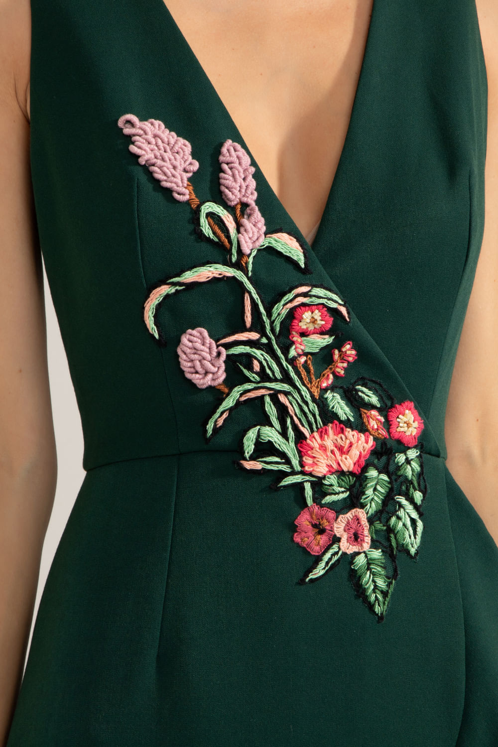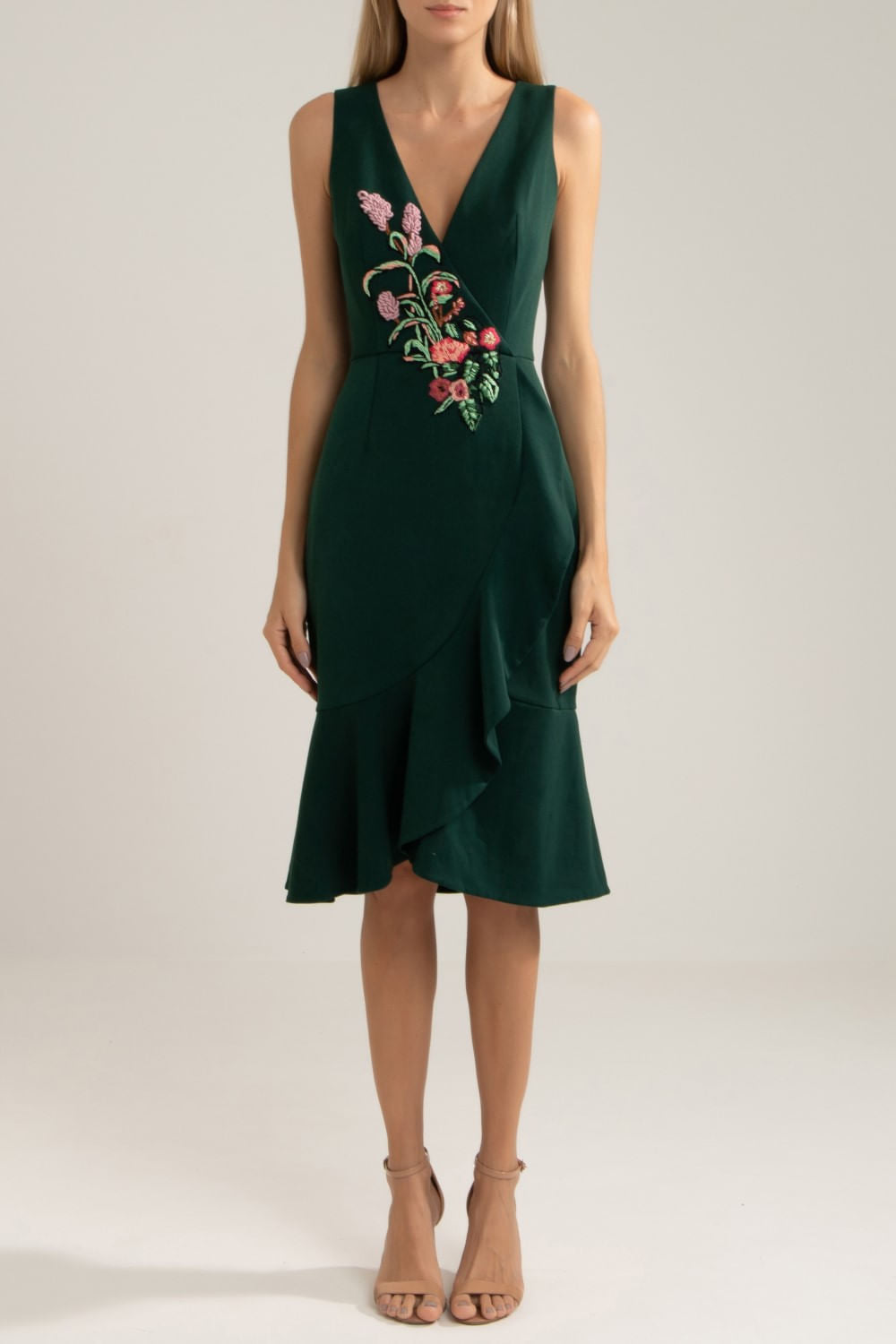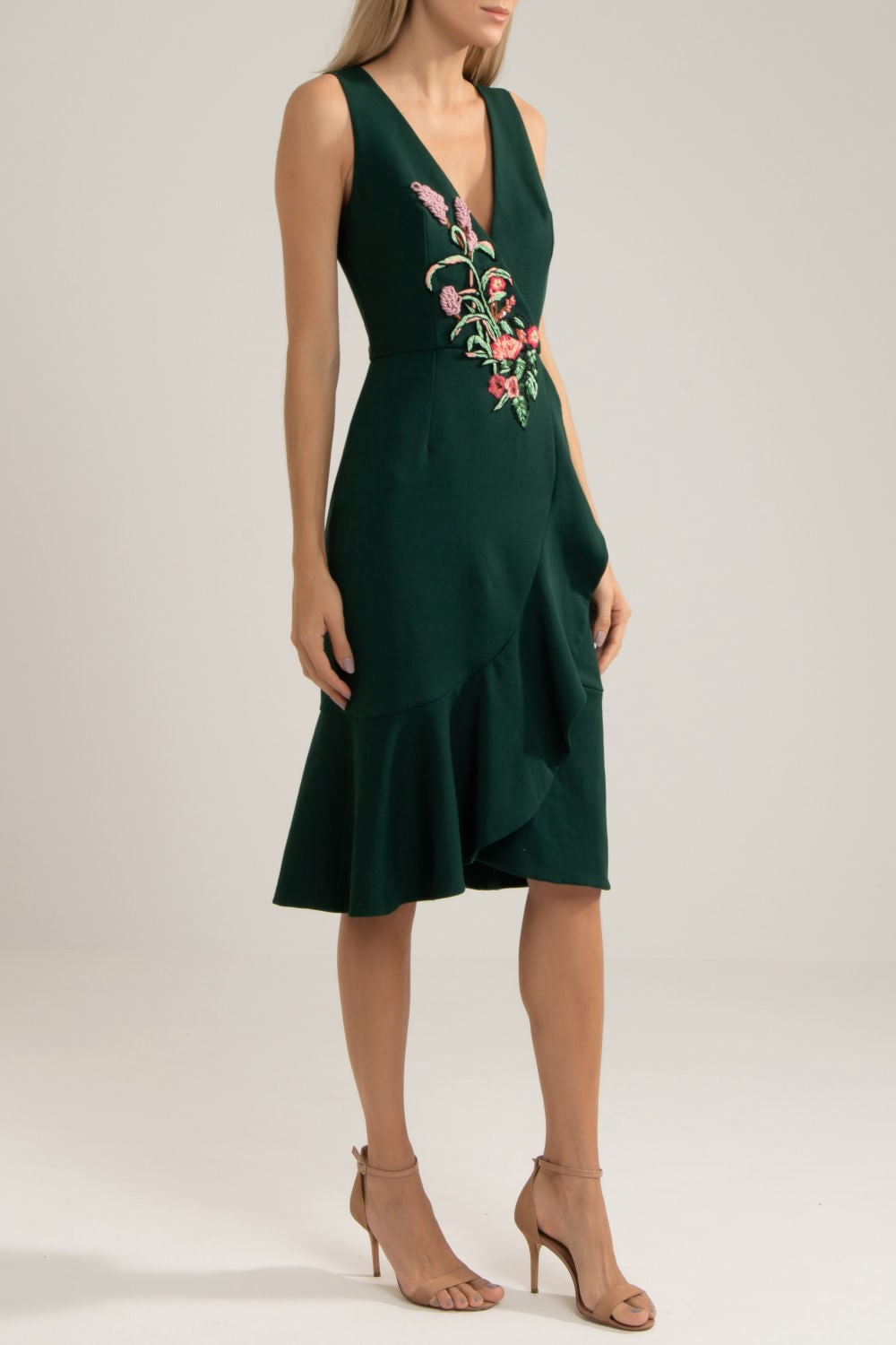 Vestido com decote "V", aplicação de bordado no busto, babado em toda a barra e zíper invisível no centro das costas.